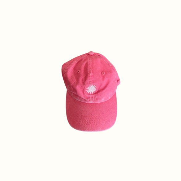 A beach-ready washed red cotton cap. It features a small, embroidered sun icon that perfectly matches the painting and the overall theme. It’s a stylish and practical accessory for sunny days and an everyday reminder of their creative side.